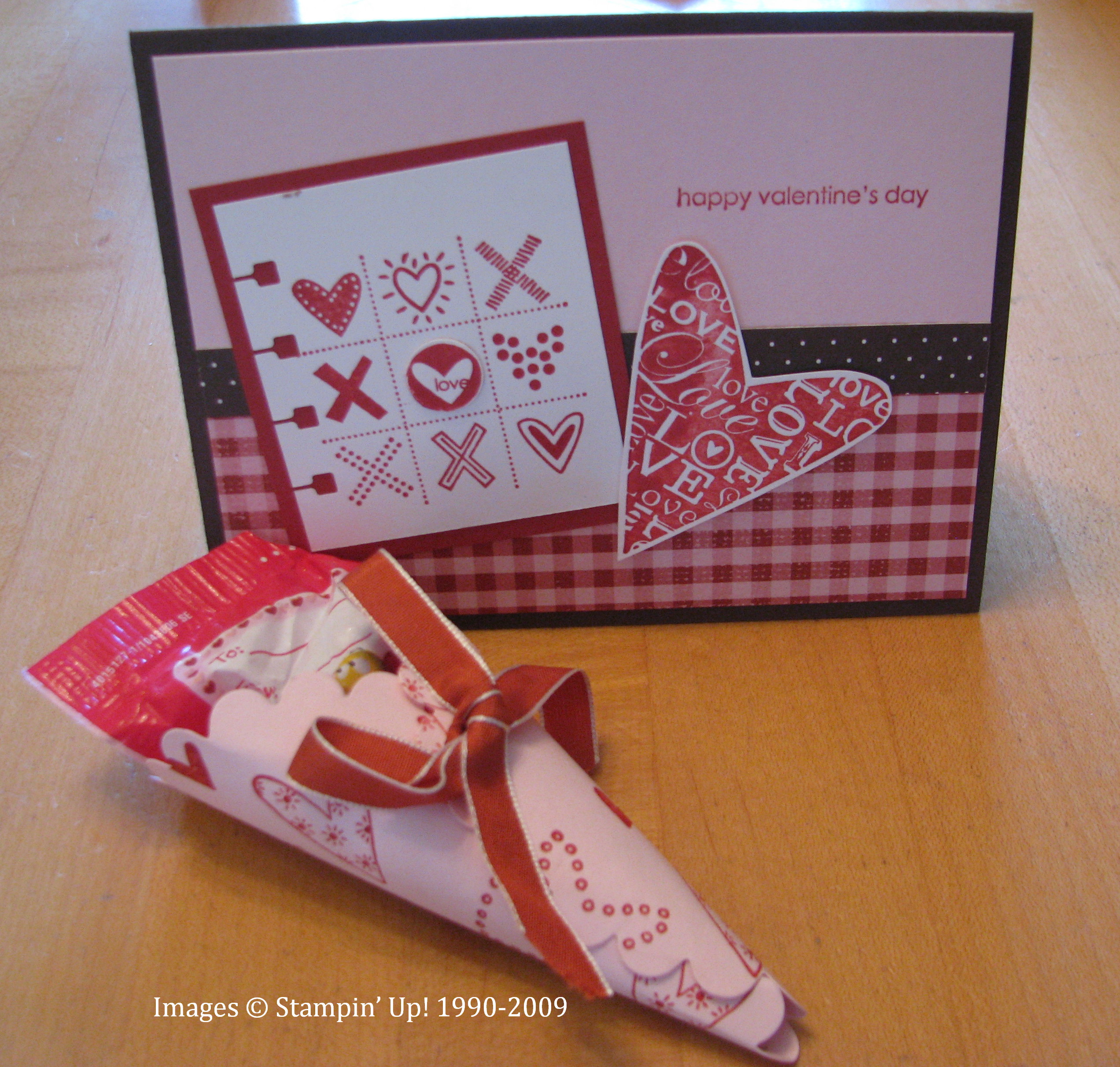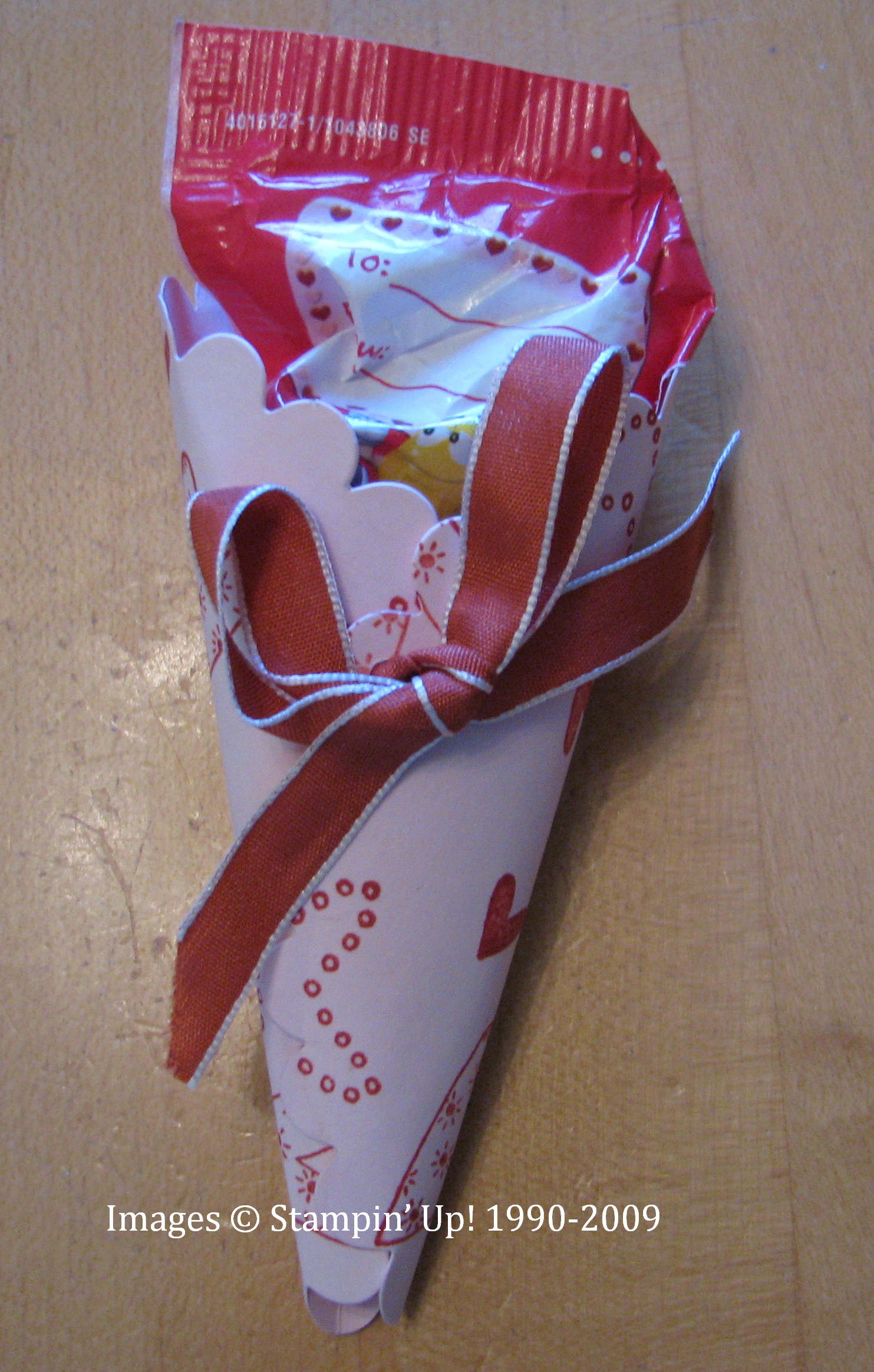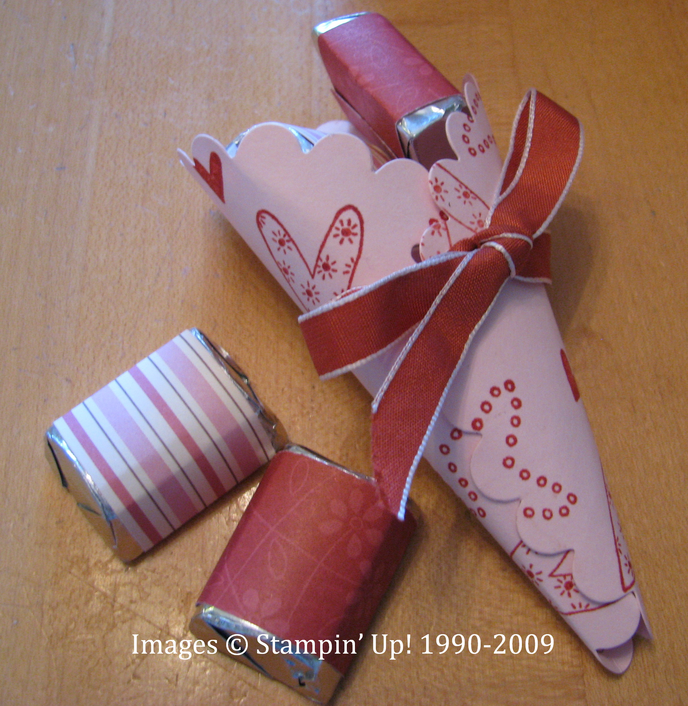 Here's an idea I have seen many other stampers make. I love using my Big Shot, and this paper cone is made with the Scallop Circle die cut. I used Pink Pirouette card stock and stamped with Red Riding Hood ink with the hearts from the set "Love You Much". I gently rolled the paper into a cone shape, punched two holes and put the ribbon through. You can also add a little glue to hold the bottom edge. Tombow Multi Purpose Glue (in the green bottle!) works great for this. Just hold it for a second until it adheres. These candies are Hershey Nuggets wrapped in Candy Lane Designer Paper. Love doing those! Wouldn't your valentine love getting this little gift?! You can shop for any of these Stampin' Up! products by contacting me or by going to the online store! And don't forget about Sale-A-Bration!