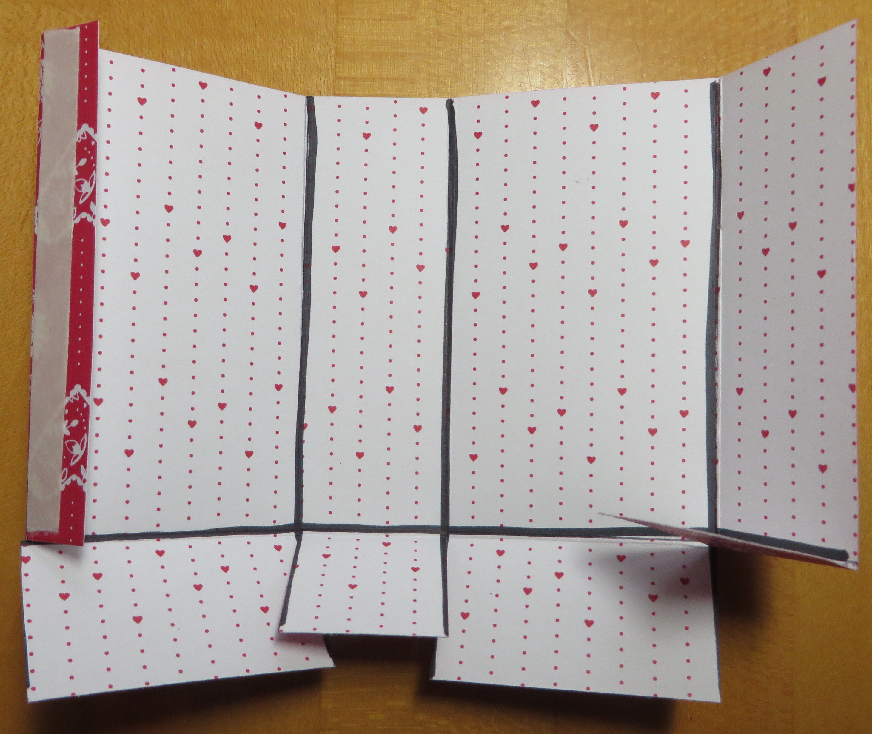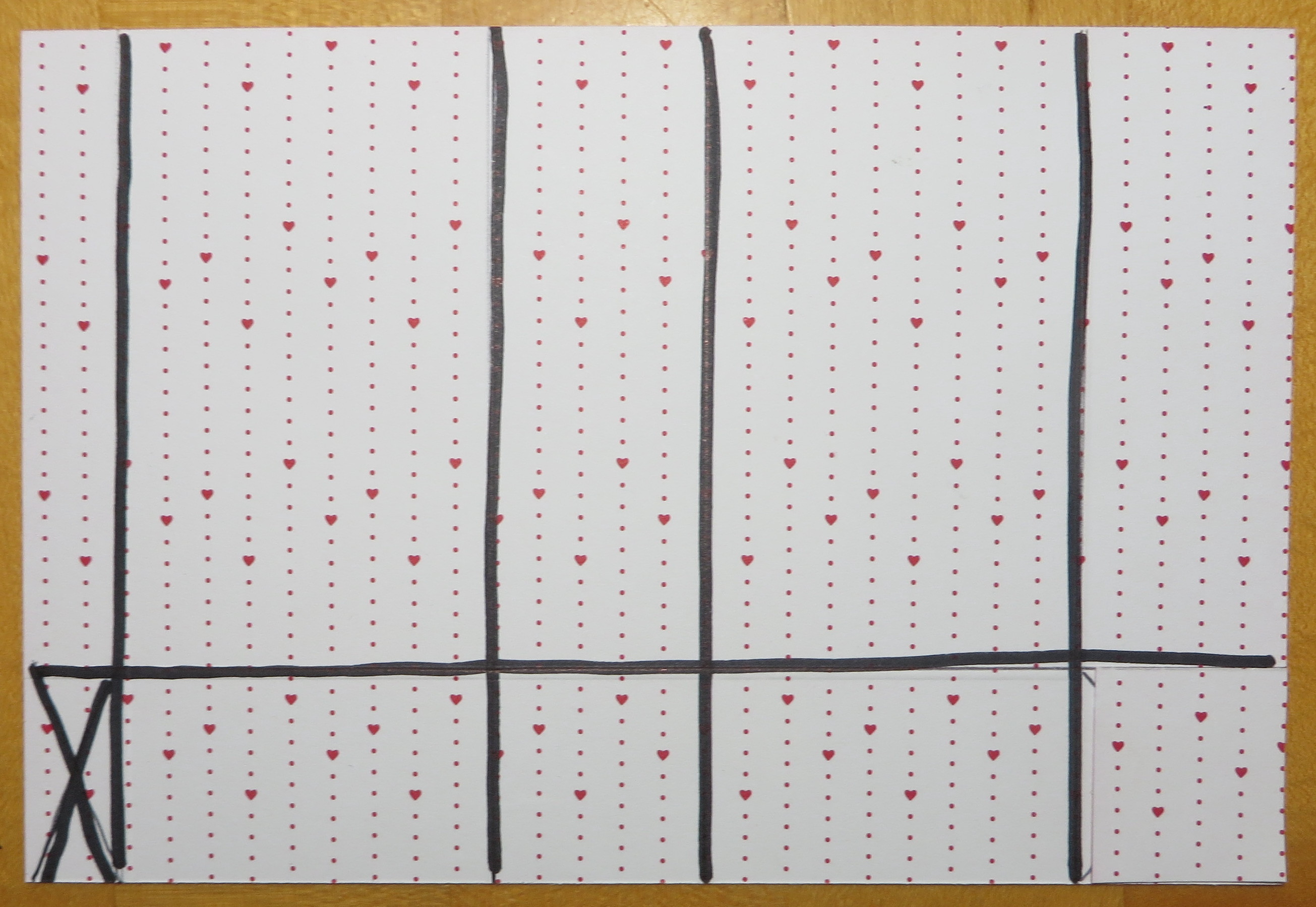 This is the inside of what will be my treat bag but I drew on the score lines so you could see. The “x” marks the area that you will cut off entirely. You can see how the score line going across lengthwise indicates where the bottom of the bag will be, so watch your pattern.