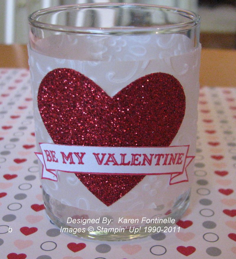 You probably have these little glass votive candle holders around your house, or if you need to buy some they are easy to find. All you need to do basically is wrap some paper around the glass and decorate! I chose to emboss the Stampin' Up! White Vellum Card Stock #101856 with the Finial Press Embossing Folder #115963. That looked so pretty just by itself! And of course I had to use the Red Glimmer Paper #121790 in the Occasions Mini Catalog because it is so beautiful to punch a large heart….and no glitter falls off! Again, it was plenty pretty with just the heart on the vellum! I tried tying various ribbons around the middle but nothing seemed quite right. Then I stamped the greeting with the "Be My Valentine" stamp #122045 in Real Red and just cut out the banner. Seemed perfect to me as a finishing touch! There are lots of easy valentine craft ideas and this is one of them! Wouldn't this be a great valentine craft for kids?!