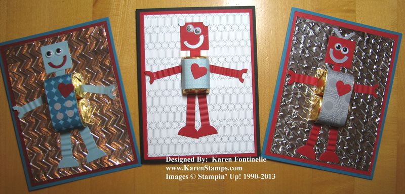Valentines are sometimes all "mushy" but here is a cute idea for valentines for boys! Not that they can't be for girls, too, of course…but in the craft world, it's often more difficult to find "boy" things. Anybody who loves robots will like these valentines…and not just for Valentine's Day either! They would be just as cute for birthday cards or some kind of birthday party favors. The only bad thing is that the chocolate candy making up the body is pretty tempting and then the robot is kind of destroyed! But that's okay…we have to remember, it is only paper!