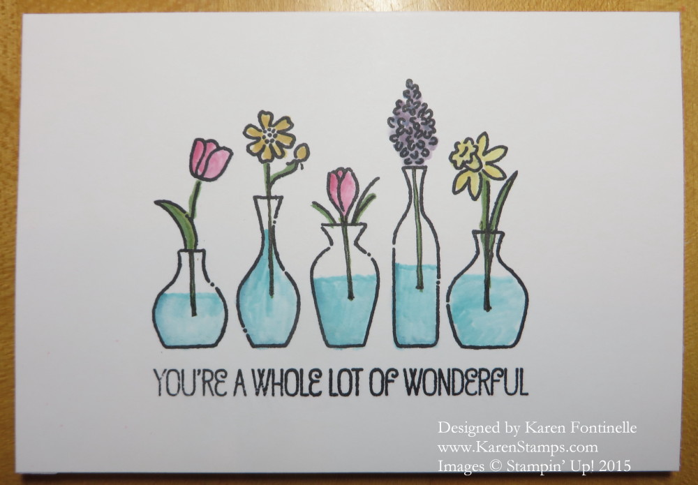 Coming in the new Holiday Catalog is a new Basic Black Archival Ink Pad so I tried it out on this card. It stamped beautifully! Then I colored in the vases and flowers with my Stampin’ Write Markers and Blender Pen. Using a Blender Pen to pick up the colors rather than coloring directly with the markers gives a lighter look. I just scribbled some marker on the stamp case itself and picked up the ink from there. You could also touch the corner of your ink pad or use ink refills for the color. So many ways to do things in stamping!