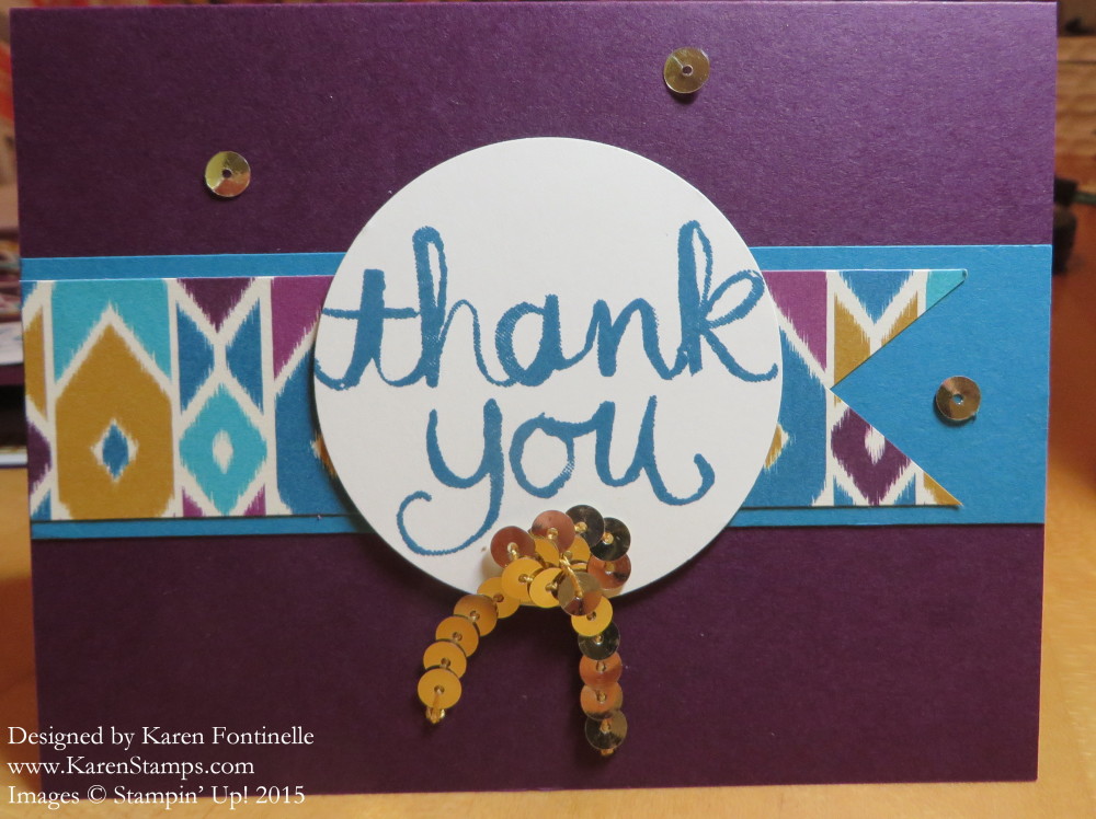The Bohemian Designer Series Paper has such rich colors, you can use just a small strip on a card and have it be enough if you aren’t really into bold patterns. One of the coordinating colors that goes with the Bohemian paper is Blackberry Bliss so I used that for the card base. For an accent color I used a strip of Island Indigo card stock. For the greeting, I used the Watercolor Thank You Wood-Mount Stamp stamped with Island Indigo ink. Then for something a little fun, I took a strip of the Gold Sequin Trim and tied it. It is adhered to the greeting with a couple of Glue Dots. And then for a final little pizzazz, I adhered a few gold sequins that I pulled off the Gold Sequin Trim and stuck them around on the card with the Multipurpose Liquid Glue.