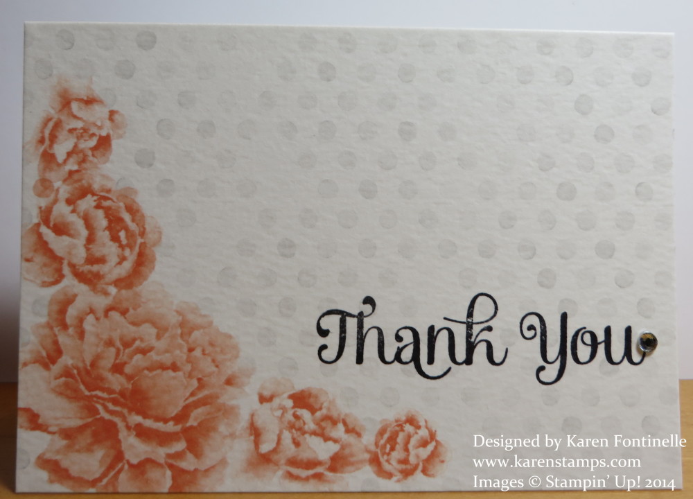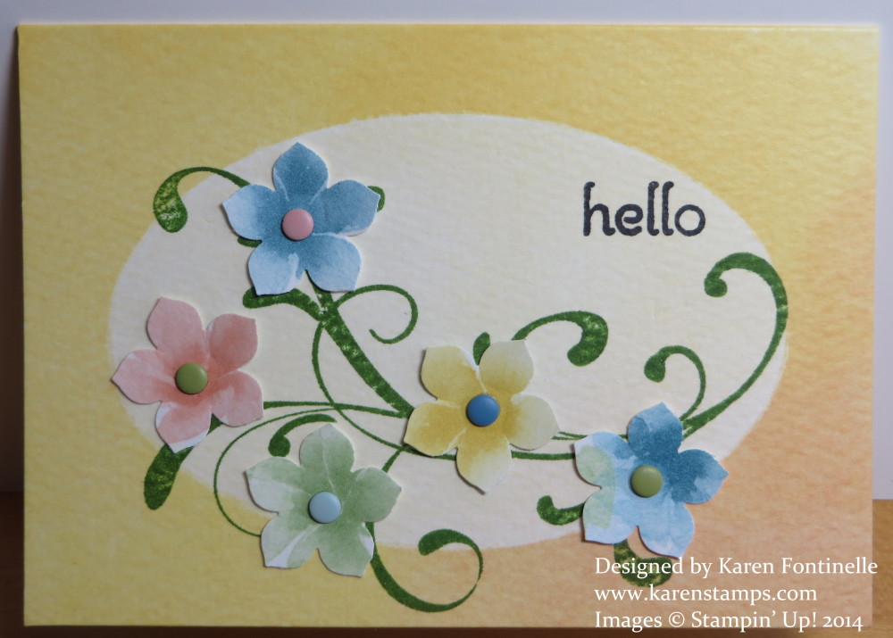 Be sure to look at the Watercolor Wonder Designer Note Cards and Envelopes in the Stampin’ Up! Occasions Catalog before they are gone. You get a nice variety, plus envelopes, and you can do a little or a lot to decorate the front of the cards! They are printed on watercolor paper and coordinate with all the other items in the Watercolor Wonder Suite in the Occasions Catalog. On this card, I stamped the vine with the the flourish in the Everything Eleanor stamp set. Then the really easy and fun part – I punched the flowers out with the Petite Petals Punch from the Watercolor Wonder Designer Series Paper! If you poke the flowers in the middle on a foam pad, such as the Stampin’ Pierce Mat with the opposite end of the Paper-Piercing Tool, it will make the petals of the flower pop up, making them 3-D. It’s very cute and just adds a little something than just being glued down flat. Add a Candy Dot to the center.