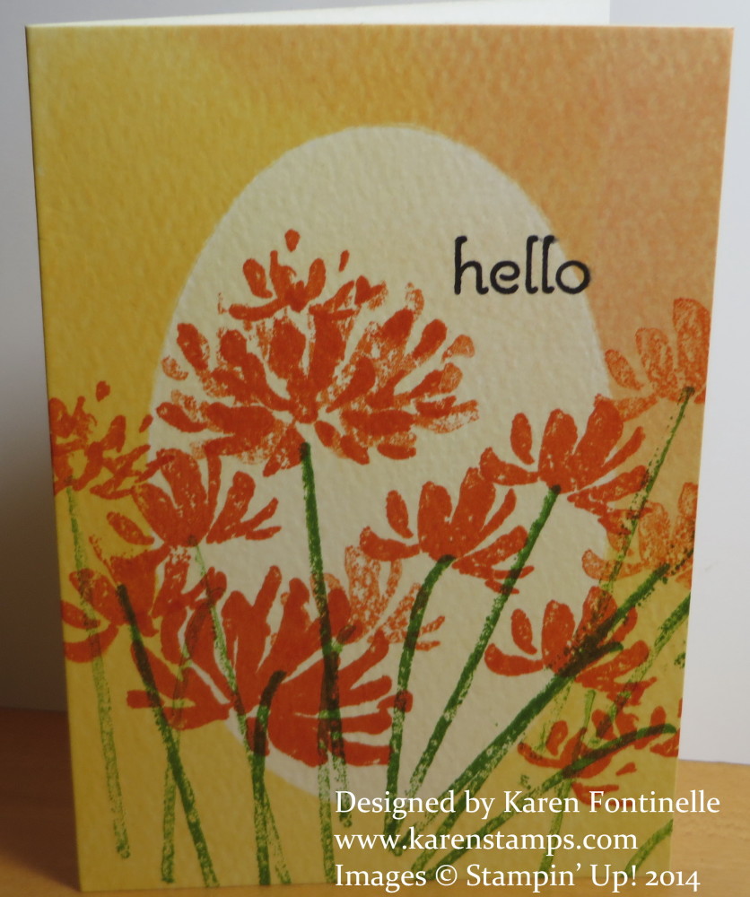 This card was almost a loss, I thought! I dropped the stem stamp on the edge of the card which I thought ruined it. But no! I decided to stamp LOTS of stems so the wayward stems would not be obvious. It worked out well, especially stamping off and stamping the lighter stems just for them all to blend in together. The stems and flowers are from the Too Kind Stamp Set.