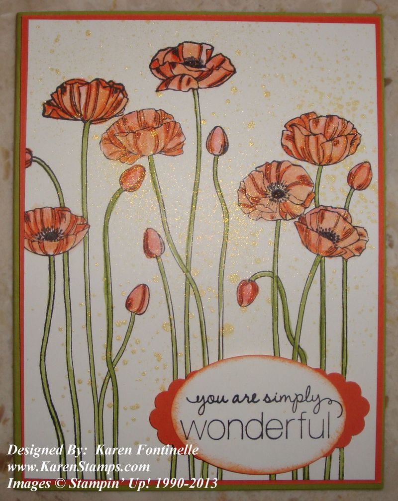 My Mother's Day card is stamped with Pleasant Poppies (a large background stamp) in Stazon Black Ink. The flowers and stems are colored in with Calypso Coral and Tangerine Tango Stampin' Write Markers using an Aqua Painter and just the markers themselves. As a final touch I spritzed the card with Gold Glow Smooch Spritz. I think you can see it in the photo.