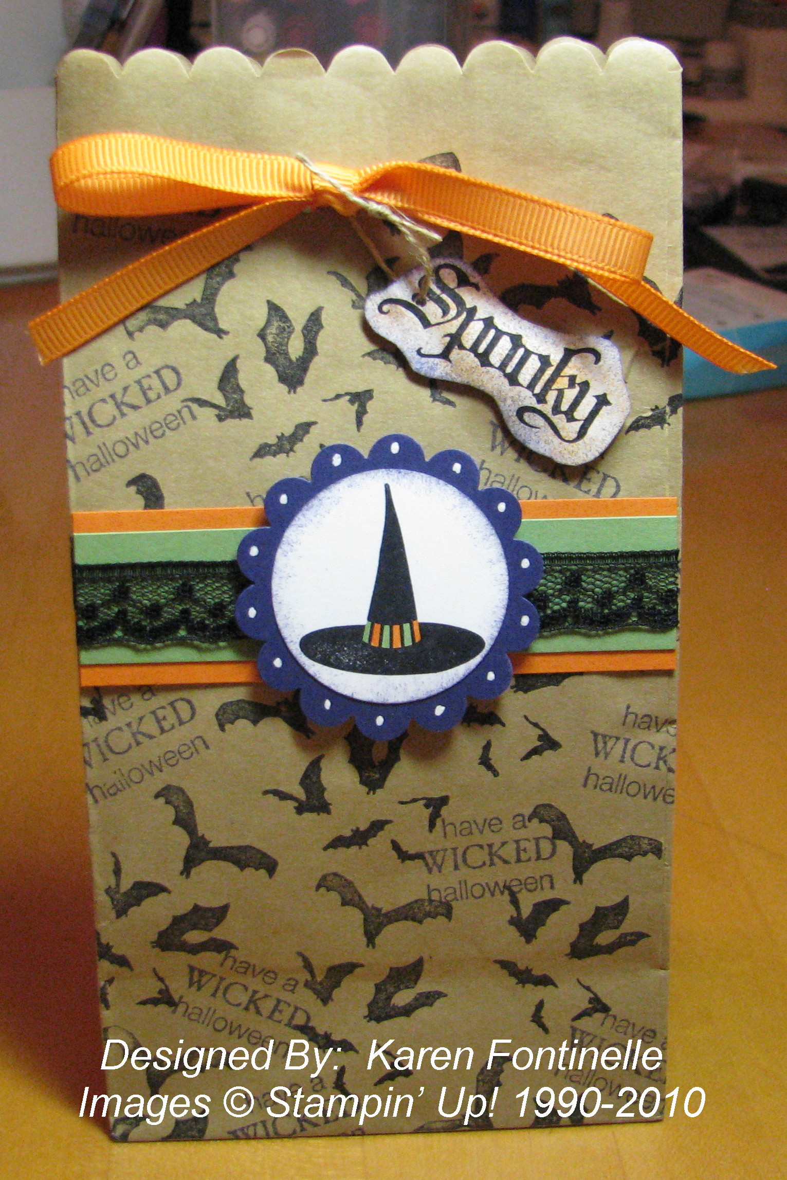 I just began stamping the little bats on the bag with Black Stazon ink and as an afterthought stamped the "have a Wicked halloween" on there with Concord Crush….but on this bag, the dark purple looks more like black. I added a strip of Pumpkin Pie (3 1/2" x 1") and Wild Wasabi card stock (3 1/2" x 3/4") across the front. I also stamped the witches hat in Stazon Black on Whisper White and punched it out with the 1 3/8" Circle Punch, sponged it a little with Concord Crush ink, then adhered to a Concord Crush Scallop Circle Punch #119854. I colored in the band on the witches hat with Stampin' Write Markers and added some White Gel Pen dots to the scallops. It still needed something, and once I added a strip of the 1/2" Raven Lace Trim #120988 in the Holiday Mini I loved it! Adhere the scallop circle with a couple of Stampin' Dimensionals.