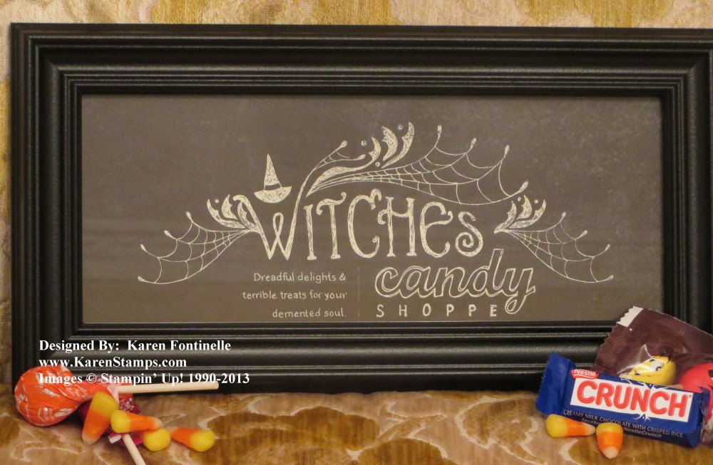 Happy Halloween! Today is the day! I can’t believe October 31st is here and with it, the end of all things crafty for Halloween! I don’t think I got my fill of making cards and treats for Halloween. Today’s project is probably the easiest thing you can make with Stampin’ Up! designer paper! Two of the sheets in the Witches’ Brew Designer Series Paper are this printed design with lots of Halloween treat words on it. Just cut it apart and you can frame this top portion of the sheet! It fits perfectly into a cheap frame. If you have a larger frame, just use a larger piece of card stock or designer paper as a mat behind it. You could also add some extra elements and embellishments to this sheet and even leave the glass off for a real 3D piece of framed Halloween art!
