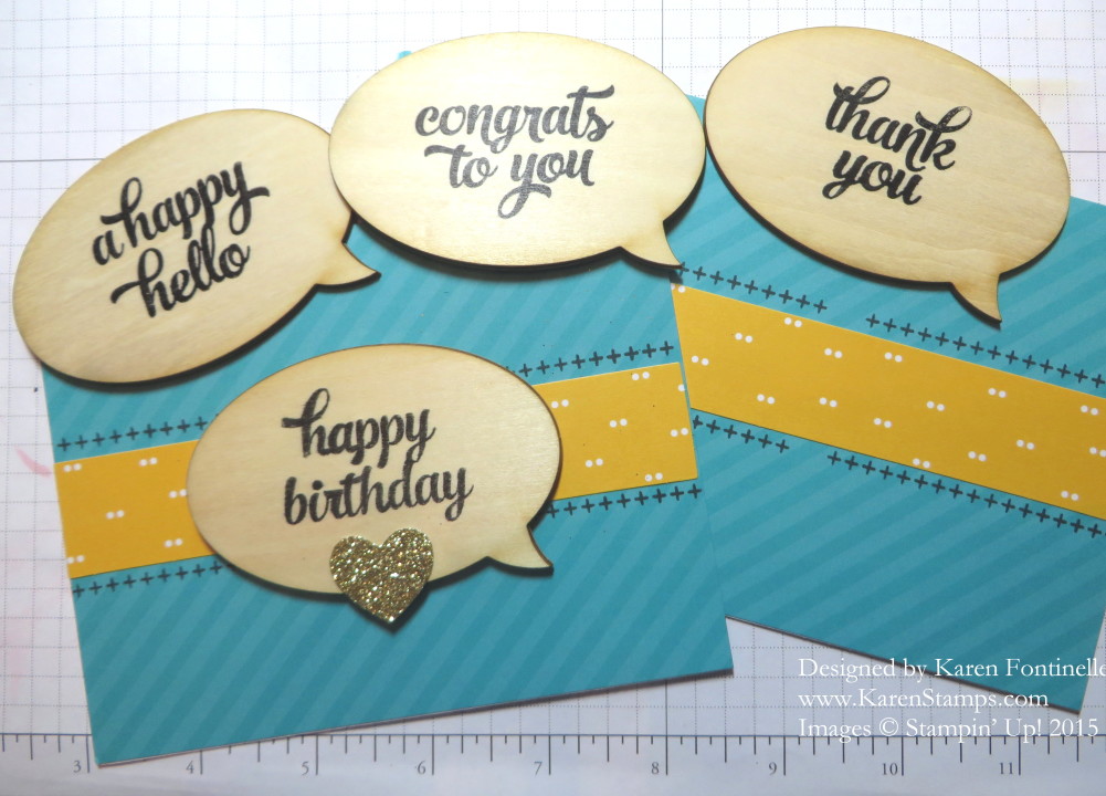 The word bubbles are wooden embellishments and really cute. You stamp the greeting of your choice on them with Stazon Ink. If your stamps are new and you haven’t used them before, stamp several times on scrap paper to get them ready to go! I think they often have a manufacturing coating on them or just need to get used to the ink before they stamp really well. On one of the wooden pieces, my words did NOT stamp very well, so I took a Sharpie pen (it was a pen, not a marker) and filled in carefully. It wasn’t that hard and worked out well. I could have just turned it over, too, and tried again. The little gold glimmer heart is already die cut for you, just punch it out of the paper and adhere it to the wooden piece with Glue Dots or other adhesive.