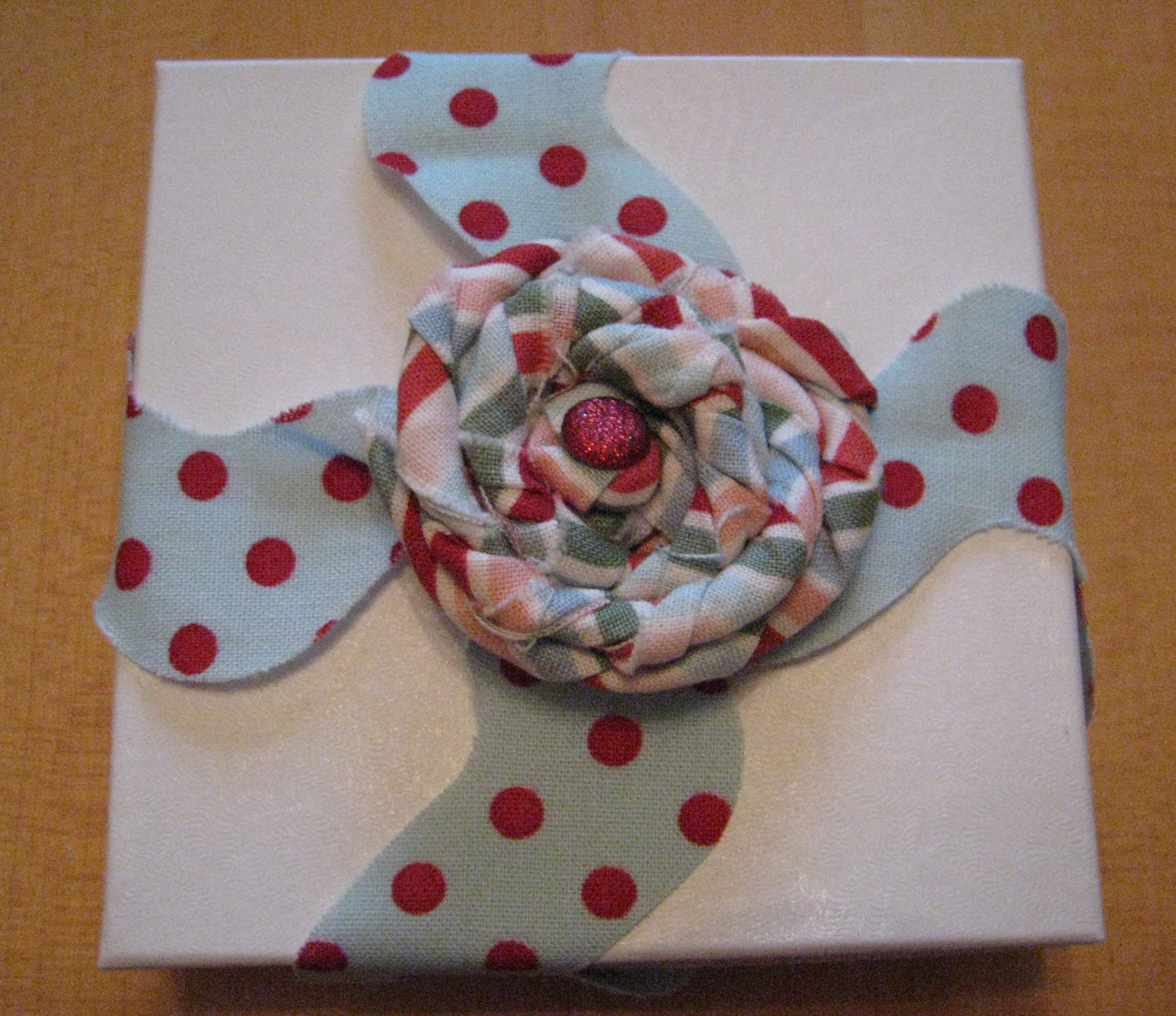 And then I tried making a little ribbon flower out of one of the other fabrics in the set to decorate and added a little Glimmer Brad #119740 to the center.