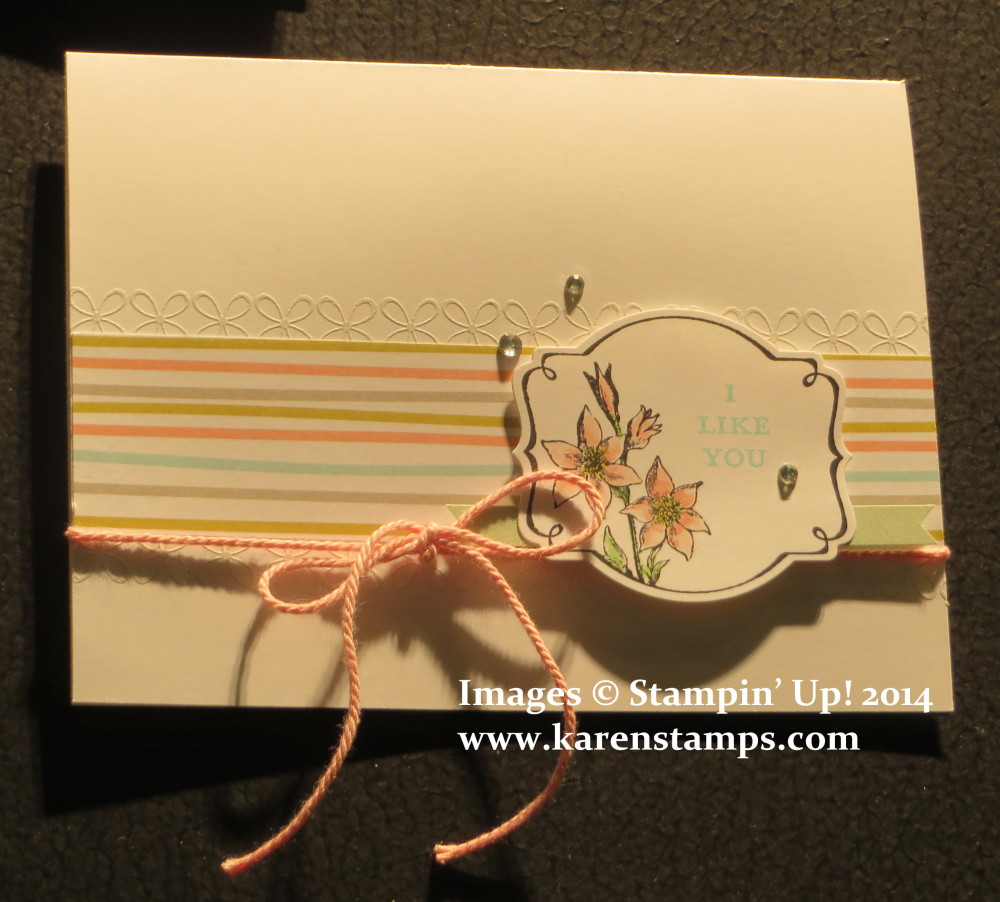 When Sale-A-Bration begins January 28th, you could chose this stamp set, You’re Lovely, for your FREE Sale-A-Bration product with a $50 purchase! I thought this was a beautiful card on display at Stampin’ Up! Leadership. The delicate little white design I think is embossed. It’s my favorite part of the card.