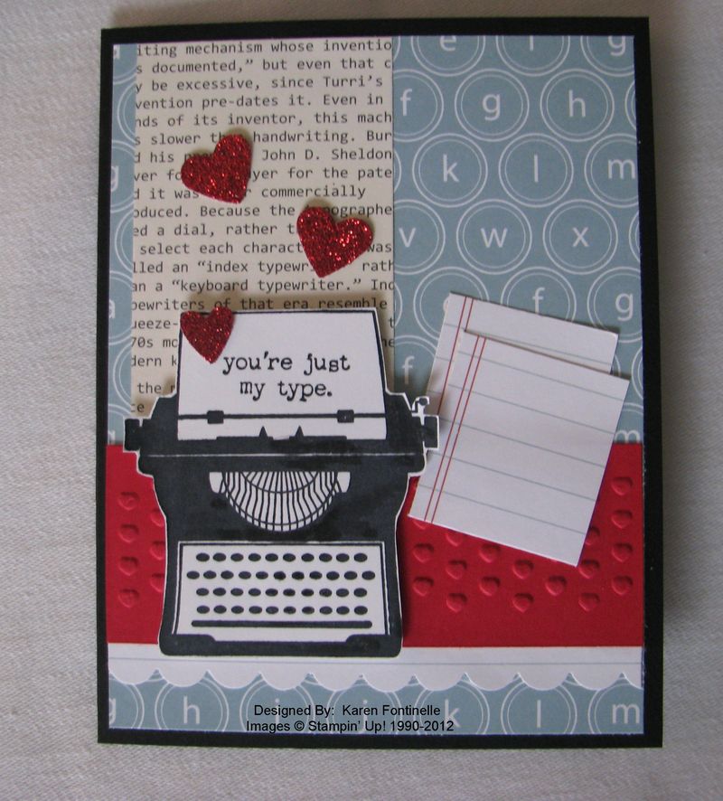I love this "You're My Type" stamp set and thought it would make a good Valentine card for my husband. Then I saw a sample online where someone used the Just Add Cake Designer Series Paper along with the typewriter since it looks a little like typewriter keys! I thought it was brilliant and wondered why I didn't think of that! So here is the paper as a background for my card, plus bits of the "notebook" paper also in that pack, plus the First Edition Specialty Paper.