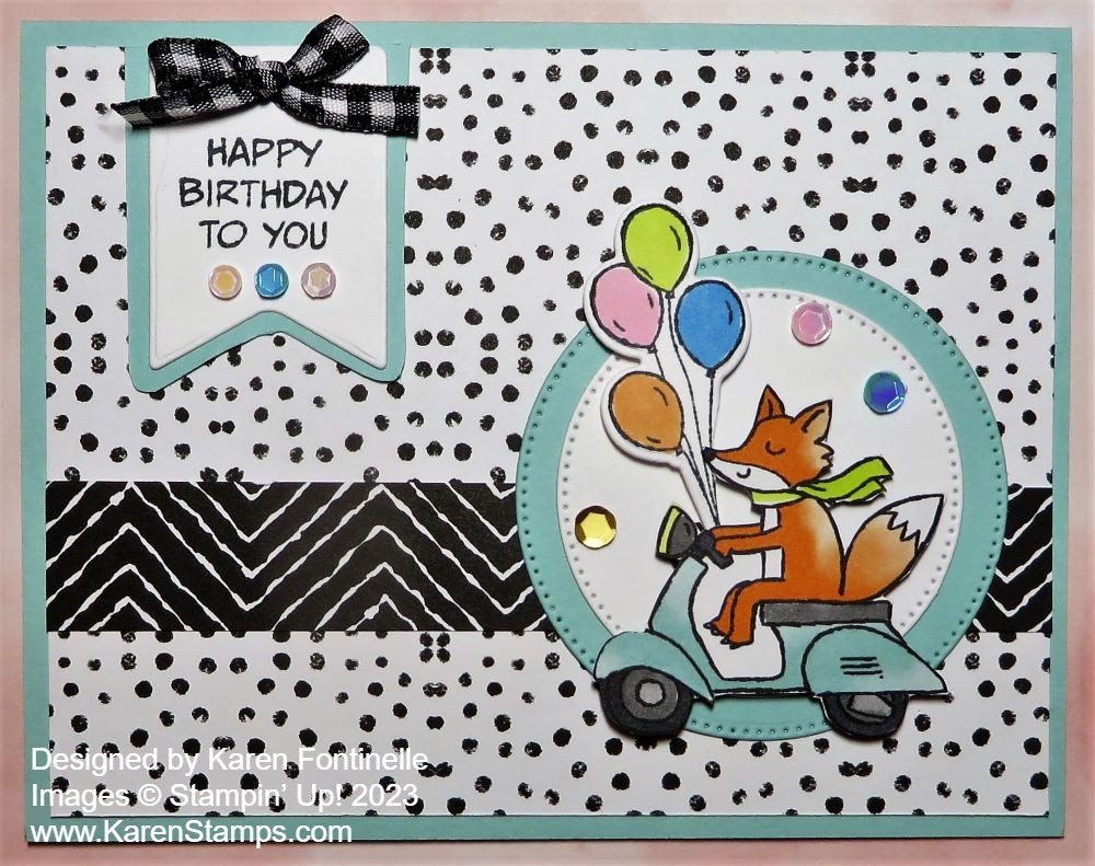 After adhering the circles to the card front, I cut out the fox on the scooter with my Paper Snips and popped him up over the circles with Stampin’ Dimensionals, plus stuck on the balloons, too.